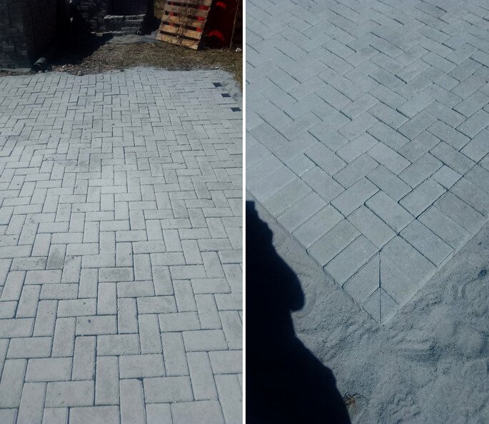 Preparação de base com máquina, nivelamento, assentamento do piso 16 Faces, arremate, rejunte e compactação.
