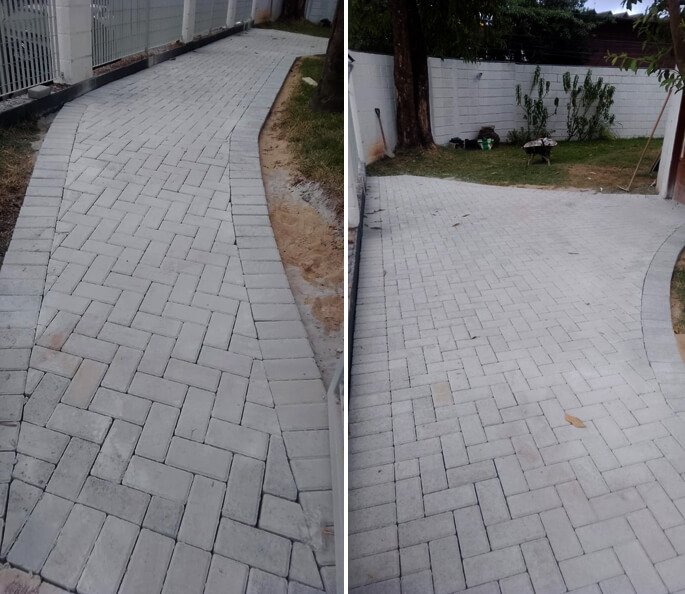 Nivelamento, assentamento do piso intertravado, arremate, rejunte e compactação.