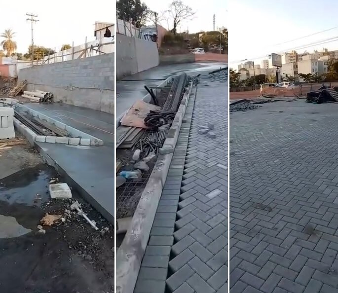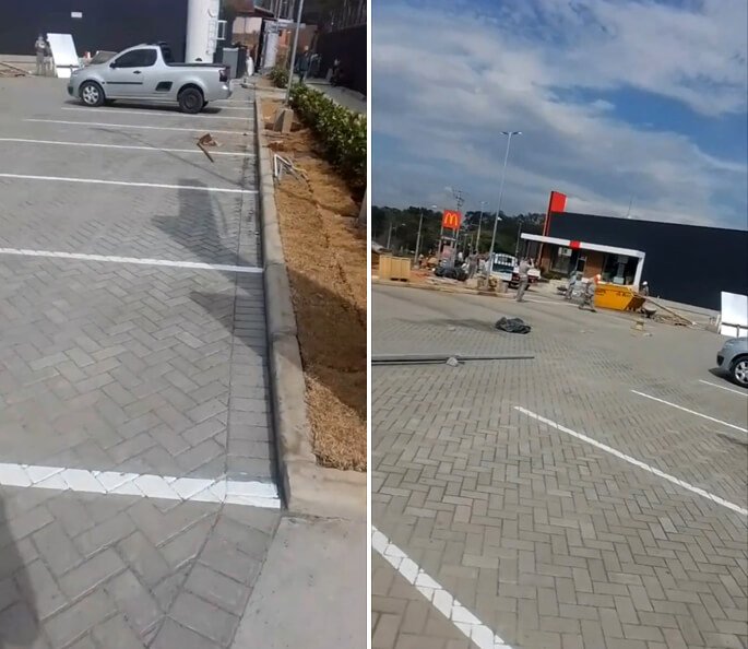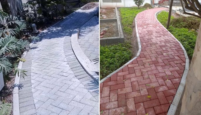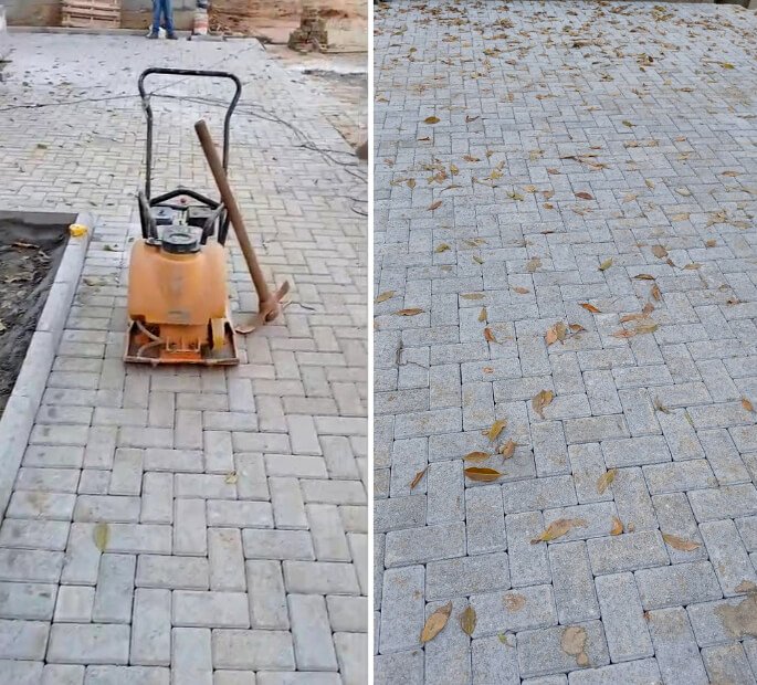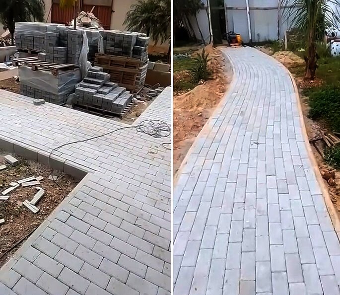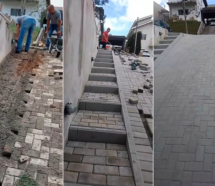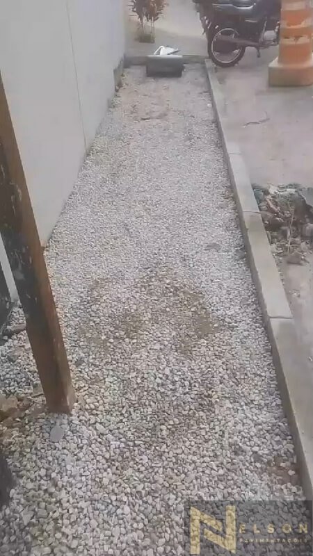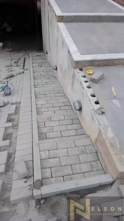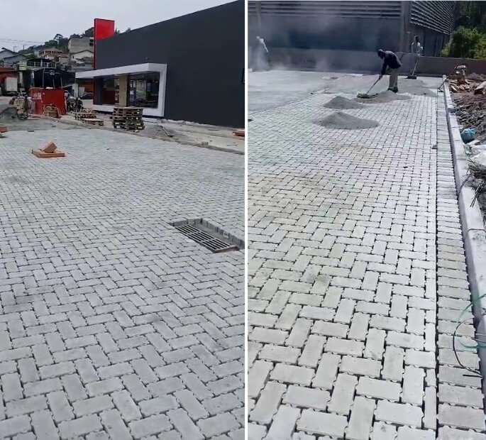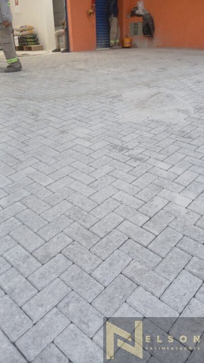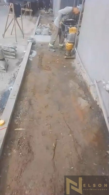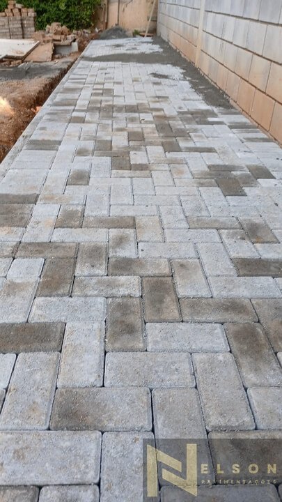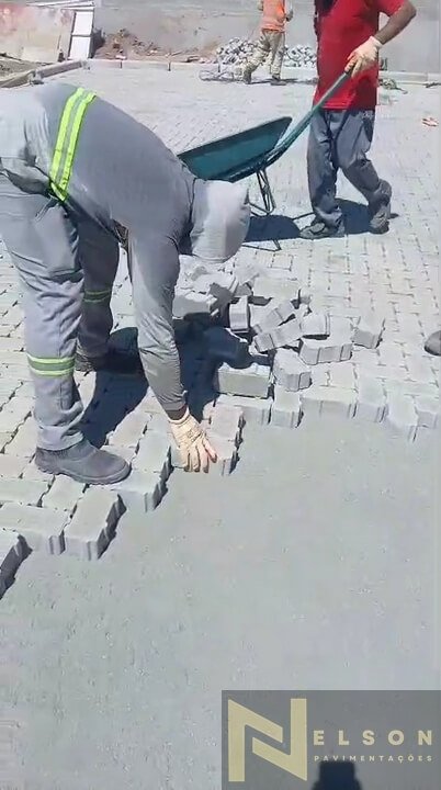 Nivelamento, assentamento do piso intertravado, arremate, rejunte e compactação.